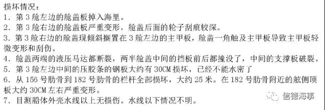 事故導(dǎo)致了百萬美金的巨大損失;幸運的是,事故發(fā)生時沒有任何人員站立在該艙左側(cè)甲板上;可以想象的是:如果當(dāng)時有人站立在左側(cè),則很難幸免!