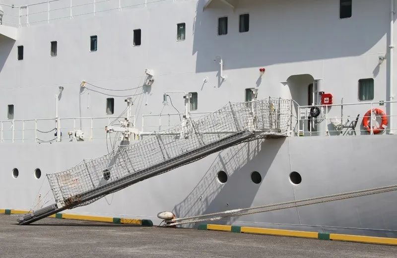 根據(jù)新生效的GB/T11701-2021《船用舷梯的基本規(guī)定》(3月1日起施行),舷梯主要分為兩類: (1)旋轉(zhuǎn)平臺式舷梯 單節(jié)舷梯、多節(jié)舷梯或伸縮舷梯的結(jié)構(gòu)與上面的旋轉(zhuǎn)平臺鉸接,可在船與登梯底面之間改變方向和傾斜角度。舷梯可用鋼絲繩或鏈從較低的(各)懸掛點(diǎn)掛住,或用固定在舷梯底部滾柱支持。 (2)固定平臺式舷梯 單節(jié)舷梯、多節(jié)舷梯或伸縮舷梯的結(jié)構(gòu)與上面的固定平臺鉸接,可在船和登梯底面之間改變傾斜角度。舷梯用鋼絲繩或鏈從較低的(各)懸掛點(diǎn)掛住,單獨(dú)使用的引航員舷梯采用此固定平臺式舷梯。 根據(jù)SOLAS第II-1章第3-9條款,凡是2010年1月1日及以后建造的船舶,必須在船上安裝經(jīng)認(rèn)可的登/離船設(shè)施,以備在港口或港口相關(guān)操作時(shí)使用。 該登/離船設(shè)施必須根據(jù)MSC.1/Circ.1331通函的要求進(jìn)行建造、測試、安裝及維護(hù),主要包括以下八點(diǎn)要求: (1)登/離船設(shè)施應(yīng)遠(yuǎn)離工作區(qū)域以及貨物或其它物體懸掛吊裝時(shí)可能通過上方的區(qū)域,該登/離船設(shè)施的目的和使用方式與引水員登 / 離船裝置是不同的; (2)應(yīng)提供足夠的照明,以照亮登/離船設(shè)施、甲板上人員登/離船和裝置控制的位置; (3)當(dāng)?shù)?離船裝置在使用時(shí),在其附近應(yīng)備有一只帶有自亮浮燈和救生浮索的救生圈(注意這里是要求一只救生圈既配備有自亮浮燈又配備有救生浮索,并且處于隨時(shí)可用狀態(tài)); (4)每部舷梯應(yīng)具有在其最大操作傾斜角時(shí),下平臺在最輕載水線以上不大于600mm的高度; (5)在每部舷梯或跳板梯的兩端應(yīng)設(shè)置一塊標(biāo)記牌,以清楚顯示安全操作和負(fù)荷限制,包括最大和最小允許設(shè)計(jì)傾斜角、設(shè)計(jì)負(fù)荷、最大底端板負(fù)荷等,如果最大操作負(fù)荷小于設(shè)計(jì)負(fù)荷,則最大操作負(fù)荷也應(yīng)顯示在標(biāo)記牌上; (6)跳板梯使用時(shí)安放水平傾斜角不應(yīng)大于30度和舷梯使用時(shí)水平傾斜角不應(yīng)大于55度; (7)在人員從登/離船設(shè)施或船舶與碼頭之間可能墜落的舷梯下應(yīng)安放安全網(wǎng); (8)正確設(shè)置舷梯下平臺的安全插銷。 收放前:應(yīng)對升降機(jī)械、鋼絲繩、滑車轉(zhuǎn)盤平臺支架等進(jìn)行檢查,確認(rèn)設(shè)備完好,鋼絲、卷筒、吊梁無障礙后方可作業(yè)。 收放過程中: (1)船靠離碼頭收放舷梯過程中,應(yīng)有專人指揮,作業(yè)人員默契配合。在浮動的梯子上進(jìn)行收起、安裝欄桿、護(hù)繩作業(yè)時(shí),應(yīng)先檢查平臺支架是否已可靠支好,并使用止蕩索,上舷梯操作人員必須系好安全帶,穿好救生衣。 (2)舷梯落岸下踏板應(yīng)避開障礙物,安放平穩(wěn),嚴(yán)禁扭曲。吊梁、鏈條要注意絞高或安放妥當(dāng),以免碰頭和妨礙上下船。 (3)由于潮夕、裝卸貨、碼頭環(huán)境等因素影響,舷梯不能放置碼頭時(shí),要注意隨時(shí)調(diào)整舷梯高度。當(dāng)舷梯下踏板離碼頭較高較遠(yuǎn)時(shí),不允許勉強(qiáng)上下。梯口值班人員負(fù)責(zé)調(diào)整舷梯和提醒上下人員注意安全,必要時(shí)應(yīng)按規(guī)定加裝橋梯。 (4)由于漲落潮、移泊等原因需要松緊纜繩時(shí),應(yīng)絞起舷梯,收起橋梯,或?qū)H丝春锰菘诮谷藛T上下。在無法使用舷梯時(shí),要正確地搭設(shè)橋梯,必須綁扎牢固、裝妥扶手、掛好安全網(wǎng)后人員方可上下。禁止從船舷直接跳上碼頭,或從碼頭直接跳上船。 (5)舷梯、橋梯必須按規(guī)定張掛安全網(wǎng)。舷梯、橋梯處應(yīng)有防墜落、防滑等安全指示標(biāo)志。舷梯、橋梯的扶手、扶繩、階梯必須保持清爽、干凈、牢固,便于上下人員抓牢、踏實(shí)。 (6)禁止用舷梯吊運(yùn)物品,禁止超載。