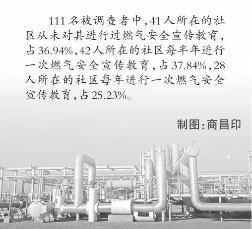 這一點(diǎn),從記者的問(wèn)卷調(diào)查結(jié)果中也得到了印證。111名被調(diào)查者中,41人所在的社區(qū)從未進(jìn)行過(guò)燃?xì)獍踩麄鹘逃?,?6.94%,42人所在的社區(qū)每半年進(jìn)行一次燃?xì)獍踩麄鹘逃?,?7.84%,28人所在的社區(qū)每年進(jìn)行一次燃?xì)獍踩麄鹘逃?,?5.23%。