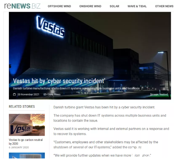 據(jù)外媒報(bào)道,11月20日維斯塔斯遭遇網(wǎng)絡(luò)安全事故,目前已經(jīng)關(guān)閉多個(gè)業(yè)務(wù)部門和地點(diǎn)的信息技術(shù)系統(tǒng),以控制這一問(wèn)題。