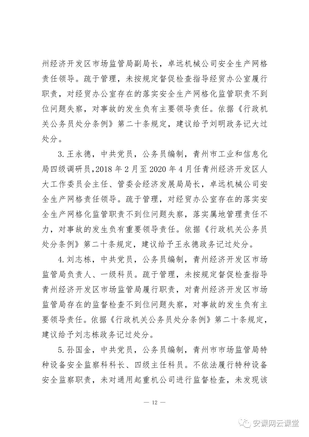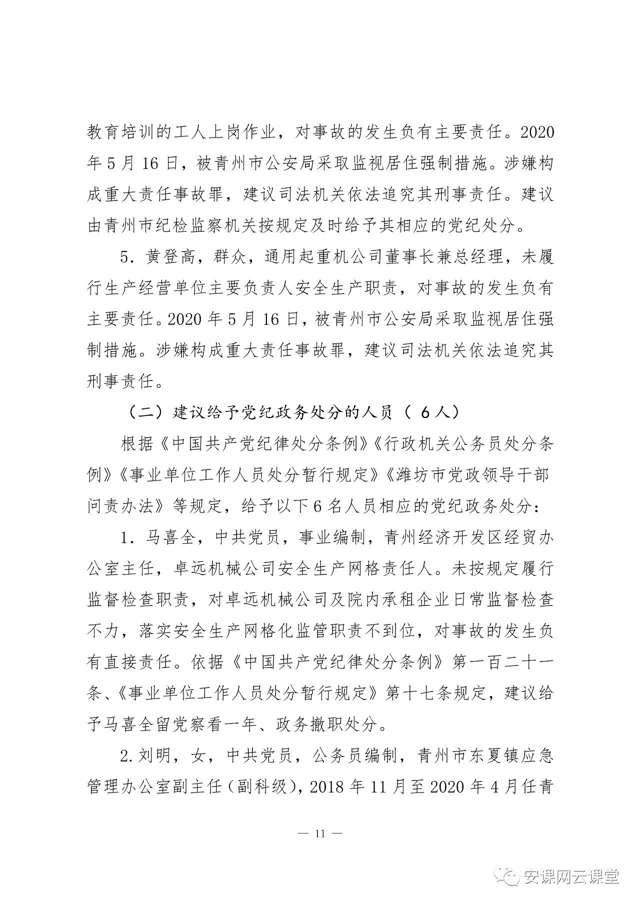 2020年5 月16 日,被青州市公安局采取監(jiān)視居住強(qiáng)制措施。涉嫌構(gòu)成重大責(zé)任事故罪,建議司法機(jī)關(guān)依法追究其刑事責(zé)任。建議由青州市紀(jì)檢監(jiān)察機(jī)關(guān)按規(guī)定及時(shí)給予其相應(yīng)的黨紀(jì)處分。