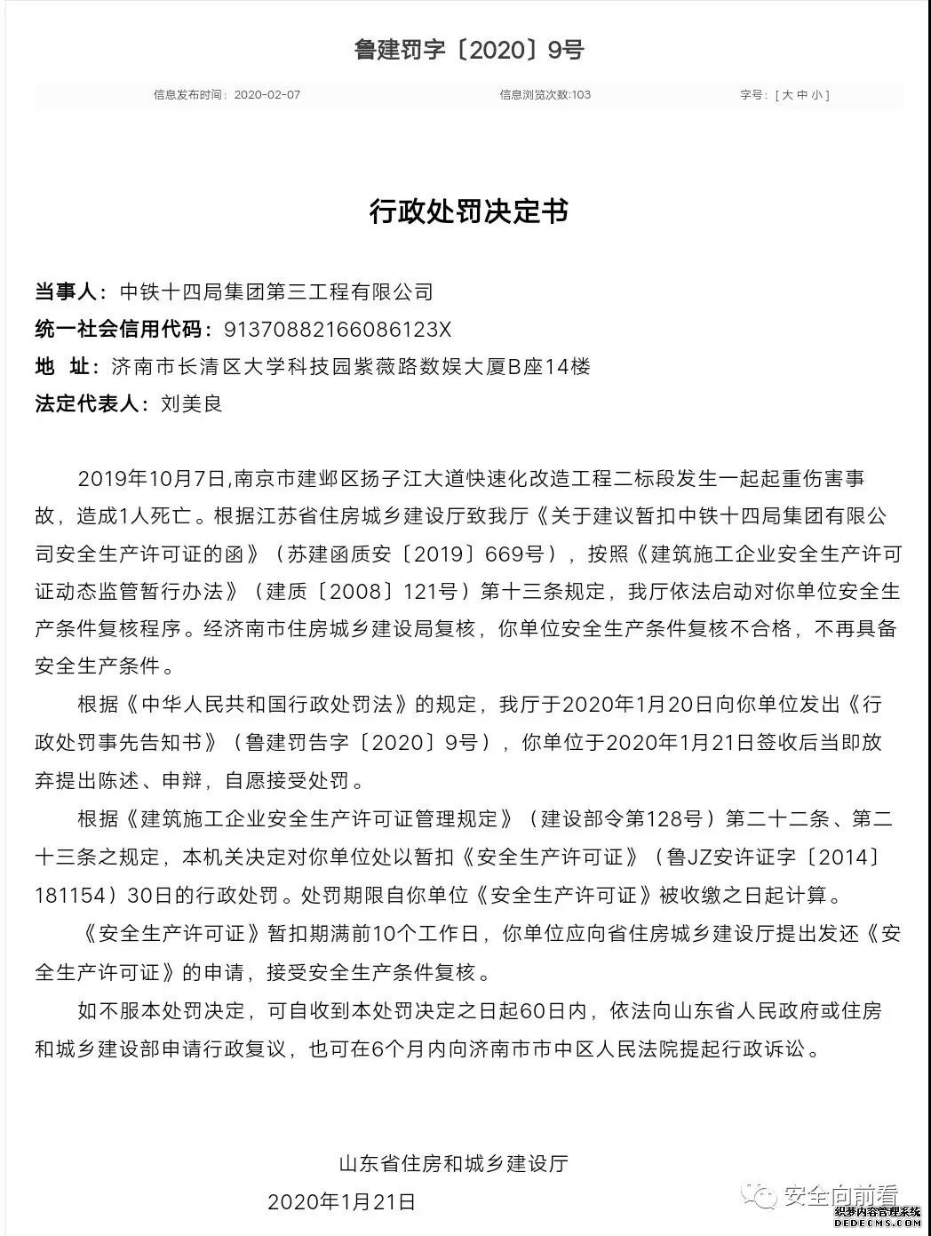 省住房城鄉(xiāng)建設(shè)廳魯建罰字〔2020〕9號行政處罰決定書顯示,2019年10月7日,南京市建鄴區(qū)揚(yáng)子江大道快速化改造工程二標(biāo)段發(fā)生一起起重傷害事故,造成1人死亡。根據(jù)江蘇省住房城鄉(xiāng)建設(shè)廳致我廳《關(guān)于建議暫扣中鐵十四局集團(tuán)有限公司安全生產(chǎn)許可證的函》(蘇建函質(zhì)安〔2019〕669號),按照《建筑施工企業(yè)安全生產(chǎn)許可證動態(tài)監(jiān)管暫行辦法》(建質(zhì)〔2008〕121號)第十三條規(guī)定,我廳依法啟動對中鐵十四局三公司安全生產(chǎn)條件復(fù)核程序。