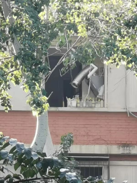 記者看到,發(fā)生爆炸的房間位于居民樓東側(cè),窗戶已經(jīng)被炸飛。受到爆炸波及,同側(cè)四層和三層住戶家的玻璃窗也出現(xiàn)了不同程度的損毀。